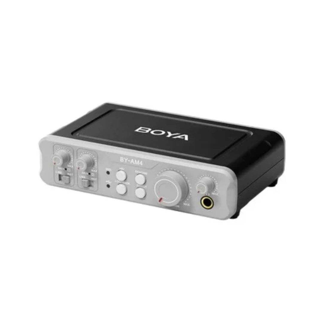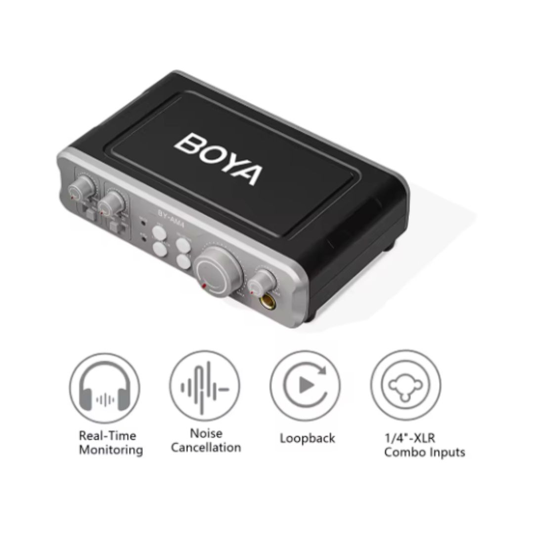 Diseñada para músicos, podcasters, creadores de contenido y técnicos de audio, la interfaz de audio Boya BY-AM4 es una solución potente y versátil para grabaciones multicanal. Gracias a sus 4 entradas combinadas XLR/TRS y su conectividad USB-C, esta interfaz te permite capturar cada detalle de tu voz o instrumento con una calidad excepcional, ya sea en casa, en estudio o en presentaciones en vivo.